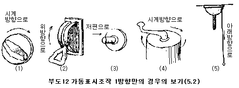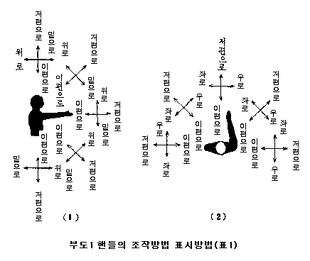 ÇÚµéÀÇ Á¶ÀÛ¹æÇâÀÌ 1¹æÇ⸸ÀÇ °æ¿ì¿¡´Â ÇÚµéÀÌ ÀÚµ¿º¹±ÍÇÏ´Â °ÍÀÌµç ¾ÈÇÏ´Â °ÍÀÌµç °£¿¡ ÇÚµéÀÇ Á¶ÀÛ¹æÇâÀº ¿øÄ¢ÀûÀ¸·Î Ç¥1ÀÇ P Á¶ÀÛÀÇ ¹æÇâÀ¸·Î ÇÑ´Ù.(ºÎµµ12(1)~(4) ÂüÁ¶), ´Ù¸¸ ²ö, ¼è»ç½½°ú °°ÀÌ Àå·Â ¶Ç´Â ¾Ç·Â¸¸ »ç¿ëÇÒ ¼ö ÀÖ´Â °ÍÀ» ÇÚµé·Î »ç¿ëÇÏ´Â °æ¿ì¿¡ ÇÑÇÏ¿© Á¶ÀÛ ¹æÇâÀ» "¹ØÀ¸·Î" ¶Ç´Â "ÀÌÆíÀ¸·Î(Àâ¾Æ´ç±è)"ÇÑ´Ù(ºÎµµ12(5)ÂüÁ¶)